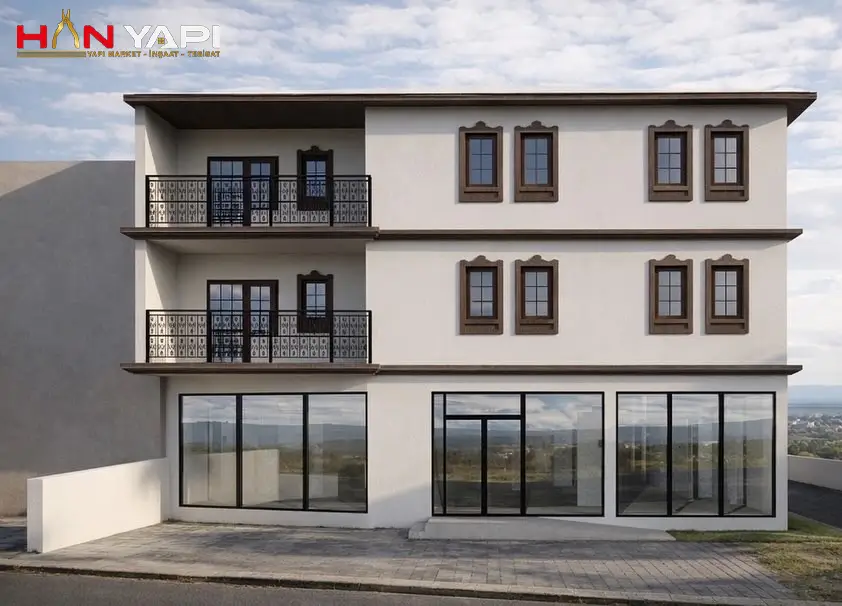 Geleneksel mimari detaylarla modern yaşam alanlarını bir araya getiren bu proje, estetik ve işlevselliği dengeli bir şekilde sunmaktadır. Alt katında geniş ve ferah ticari alanlar bulunan yapı, üst katlarda ise konforlu yaşam alanları ile çok yönlü kullanım imkanı sağlamaktadır.